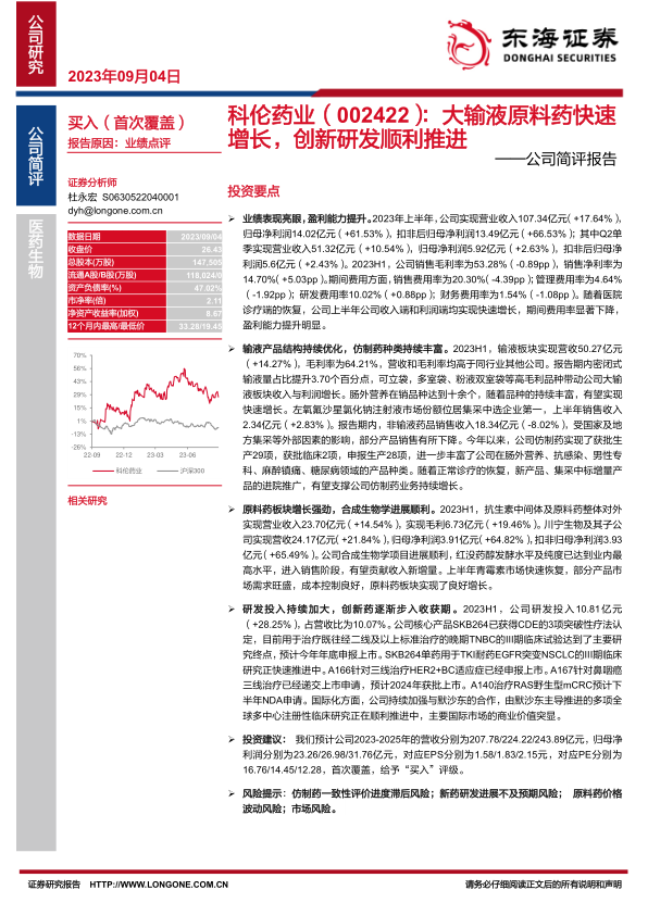 科伦药业在2023年上半年实现了显著的业绩增长和盈利能力提升,这得益于其在输液、仿制药和原料药三大核心业务板块的稳健发展和结构优化。公司在大输液领域保持领先地位,并通过高附加值产品持续优化产品结构;仿制药管线不断丰富,在男性专科和糖尿病等特色领域优势增强;原料药板块在青霉素市场恢复和合成生物学项目进展顺利的推动下实现强劲增长。同时,公司持续加大研发投入,创新药管线逐步进入收获期,特别是SKB264等核心创新药的临床进展和与默沙东的国际合作,彰显了其全球化竞争力。尽管面临仿制药集采、新药研发风险和原料药价格波动等挑战,但基于公司强大的研发实力、市场地位和未来增长潜力,报告给予“买入”评级。