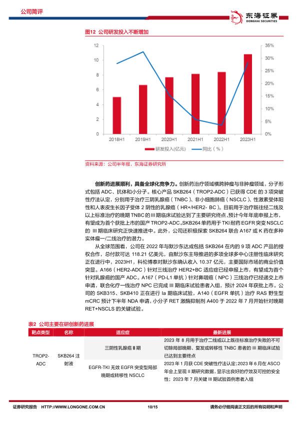 研发投入持续加大,创新药逐渐步入收获期。2023H1,公司研发投入10.81亿元(+28.25%),占营收比为10.07%。公司核心产品SKB264已获得CDE的3项突破性疗法认定,目前用于治疗既往经二线及以上标准治疗的晚期TNBC的III期临床试验达到了主要研究终点,预计今年年底申报上市。SKB264单药用于TKI耐药EGFR突变NSCLC的III期临床研究正快速推进中。A166针对三线治疗HER2+BC适应症已经申报上市。A167针对鼻咽癌三线治疗已经递交上市申请,预计2024年获批上市。A140治疗RAS野生型mCRC预计下半年NDA申请。国际化方面,公司持续加强与默沙东的合作,由默沙东主导推进的多项全球多中心注册性临床研究正在顺利推进中,主要国际市场的商业价值突显。