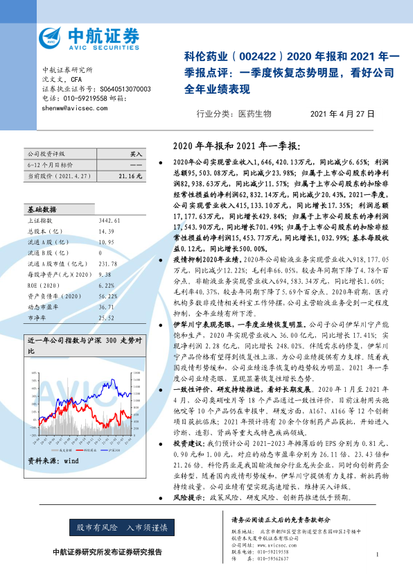 本报告对科伦药业2020年年报和2021年一季报进行了深入分析。公司一季度业绩恢复态势明显,伊犁川宁表现亮眼,一致性评价和研发持续推进,转型创新药企。维持买入评级,但需关注政策风险、研发风险以及创新药推进低于预期的风险。