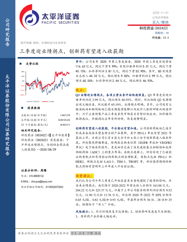 科伦药业在2020年第三季度成功实现业绩拐点,核心业务在疫情后迅速恢复,展现出强大的市场适应能力和经营韧性。公司在创新药领域的长期投入和战略布局正逐步显现成效,多款重磅创新药进入临床后期或有望上市,为公司未来业绩增长提供了坚实基础和广阔空间。太平洋证券基于对公司基本面改善和创新驱动增长的信心,维持了“买入”评级,并对未来盈利能力持乐观预期。尽管存在市场恢复不及预期和研发风险,但公司整体发展态势积极向好。