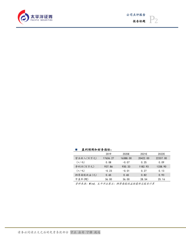 基于公司业绩拐点明确和创新药管线进展顺利,太平洋证券预计科伦药业2020-2022年营业收入将分别达到163.88亿元、204.22亿元和223.37亿元。同期,归属于上市公司股东的净利润预计分别为9.52亿元、11.90亿元和13.76亿元。对应的2020-2022年摊薄每股收益(EPS)分别为0.65元/股、0.82元/股和0.93元/股,市盈率(PE)分别为36倍、28倍和25倍。报告维持“买入”评级,目标价35元。同时,报告提示了诊疗环境恢复不达预期、创新药研发进度不及预期以及原料药产品价格大幅波动等风险。