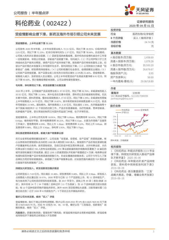科伦药业在2020年上半年受到新冠疫情的显著冲击,导致营收和净利润大幅下滑。然而,公司积极应对挑战,通过加大研发投入、深化营销体系变革以及拓展新药和海外市场,为未来的增长奠定了基础。尽管短期业绩受到影响,但长期来看,科伦药业的“三发驱动,创新增长”战略有望推动公司实现可持续发展,因此维持“买入”评级。