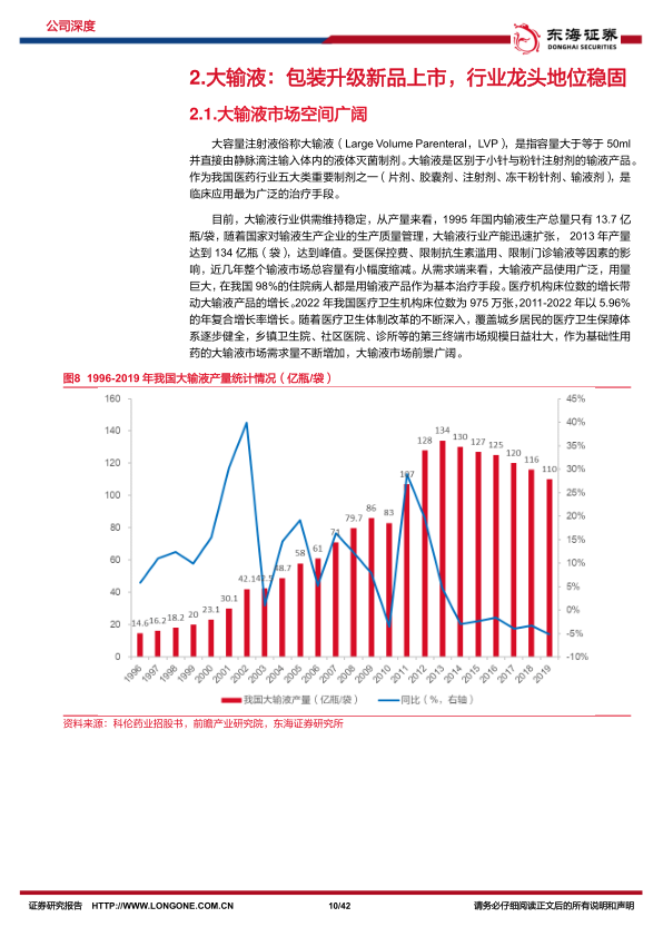 大输液作为临床应用最广泛的治疗手段之一,在我国98%的住院病人中被使用。2022年我国医疗卫生机构床位数达到975万张,2011-2022年以5.96%的年复合增长率增长,带动了大输液产品的需求。尽管受医保控费、限制抗生素滥用等政策影响,输液市场总容量有所缩减,但作为基础性用药,大输液市场前景依然广阔。国内大输液市场集中度持续提升,科伦药业、石四药、辰欣药业、华润双鹤等前四家企业在2019年合计销量占市场总量的70%。科伦药业以年均41.6亿瓶/袋的销量和97.6亿元的营业收入稳居行业第一,龙头地位稳固。