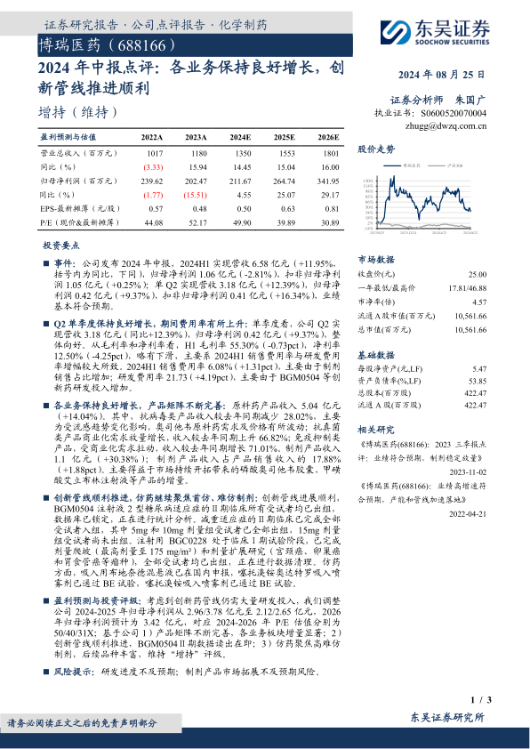 基于公司1)产品矩阵不断完善,各业务板块增量显著;2)创新管线顺利推进,BGM0504Ⅱ期数据读出在即;3)仿药聚焦高难仿制剂,后续品种丰富,分析师维持“增持”评级。同时,报告提示了研发进度不及预期和制剂产品市场拓展不及预期等风险。