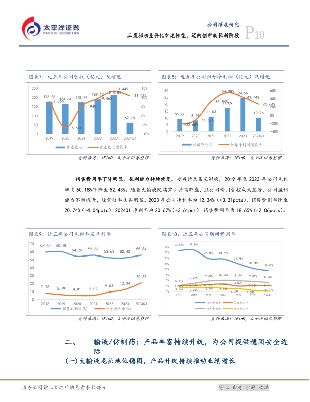 大输液+合成生物学+仿制药+创新药复合驱动,迈向创新成长新阶段。公司实施“三发驱动、创新增长”的发展战略,目前已形成由科伦药业、川宁生物、科伦博泰构成的“品”字型架构运营平台,成功转型成为大输液+原料药中间体+仿制药+创新药复合驱动的综合型制药公司。通过大输液产品持续优化迭代,同时原料药及中间体终端市场需求及价格恢复驱动业绩快速增长,近五年归母净利润CAGR为27%。2024Q1公司实现营业收入62.19亿元,同比增长11.03%,归母净利润10.26亿元,同比增长26.64%。