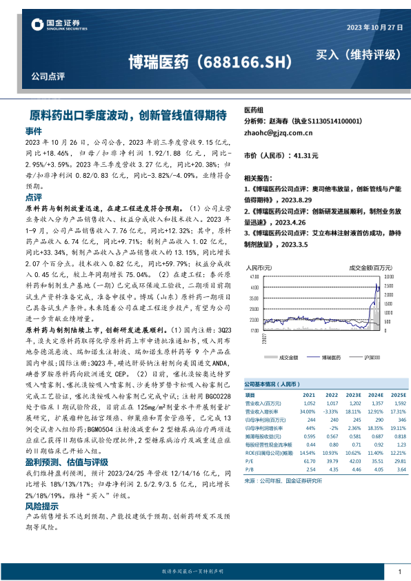 公司持续推进创新研发和产能建设,为未来发展奠定坚实基础。在建工程如泰兴原料药和制剂生产基地、博瑞(山东)原料药一期项目均按计划推进,部分已完成环保验收或具备试生产条件,预计将逐步投产并贡献业绩增量。同时,公司在国内外注册申报方面进展顺利,多款原料药和制剂产品获得批准或提交申请。创新药研发方面,BGC0228项目已进入临床I期剂量扩展研究,BGM0504注射液的减重和2型糖尿病治疗适应症已获批进入临床II期并开始入组,这些创新管线的推进有望为公司带来长期增长潜力。基于上述积极因素,国金证券维持对博瑞医药的“买入”评级,并预计未来三年营收和归母净利润将持续增长。