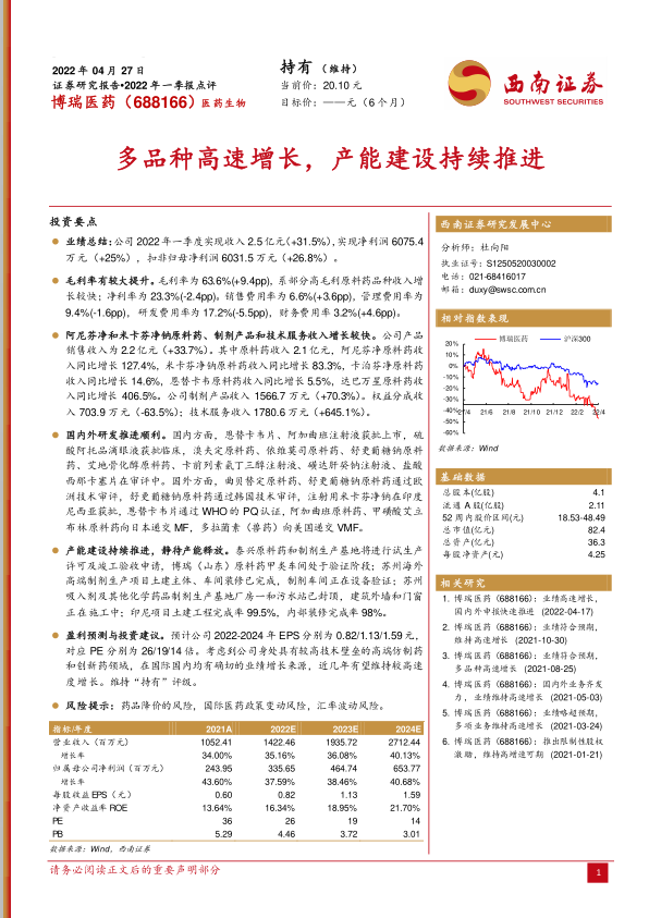 博瑞医药2022年一季报显示,公司在营收、净利润和毛利率等方面均实现了显著增长,这主要得益于高毛利原料药品种的快速增长以及公司在产品销售和研发方面的积极进展。同时,公司持续推进产能建设,为未来的业绩增长奠定了基础。维持“持有”评级,看好公司在高端仿制药和创新药领域的长期发展潜力。