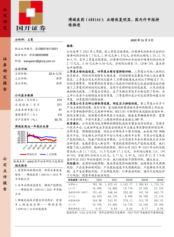 本报告的核心观点是博瑞医药三季度业绩恢复明显,国内外申报持续推进,展现出较强的增长潜力。