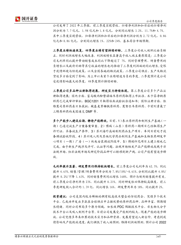 投资建议:公司是国内较为稀缺的拥有较高技术壁垒的仿创药企,凭借多个技术平台,已成功开发出多款在全球供应中占据主导优势的原料药品种,品种丰富,预期增长稳健。同时公司布局多个潜力领域,如长效PDC偶联技术平台、非生物大分子技术平台以及吸入制剂平台等。目前公司发展受产能制约较大,随着产能的逐步释放,公司凭借多年来积累的技术实力和品种资源,发展有望迈入新台阶。考虑到疫情影响及产能投放进度,我们调整了收入端预测,维持利润端预测,预计公司2022年-2024年分别实现营业收入为11.7亿元、13.9亿元和17.2亿元,分别同比增长11%、19%和24%,实现EPS分别为0.66元,0.77元,0.99元。2022年11月3日收盘价对应2022年的估值约34倍,我们继续给予推荐评级,建议关注。