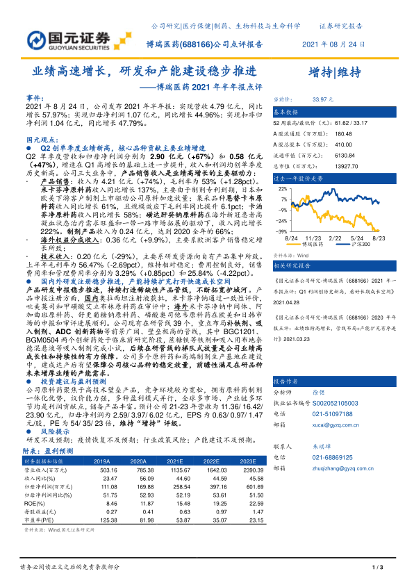 本报告对博瑞医药(688166)2021年半年报进行了深度分析,核心观点如下: