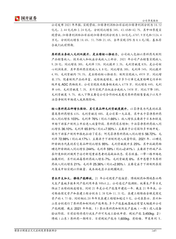 投资建议:公司是国内稀缺的拥有较高技术壁垒的仿创药企,凭借多个技术平台,已成功开发出多款在全球供应中占据主导优势的原料药品种,品种丰富,预期增长稳健。同时公司布局多个潜力领域,如长效PDC偶联技术平台、非生物大分子技术平台以及吸入制剂平台等。目前公司发展受产能制约较大,随着产能的逐步释放,公司发展有望迈入新台阶。我们预计公司2022年-2024年分别实现EPS分别为0.76元,1.03元,1.39元。2022年4月22日收盘价对应2022年的估值约28倍,我们继续给予推荐评级,建议关注。
