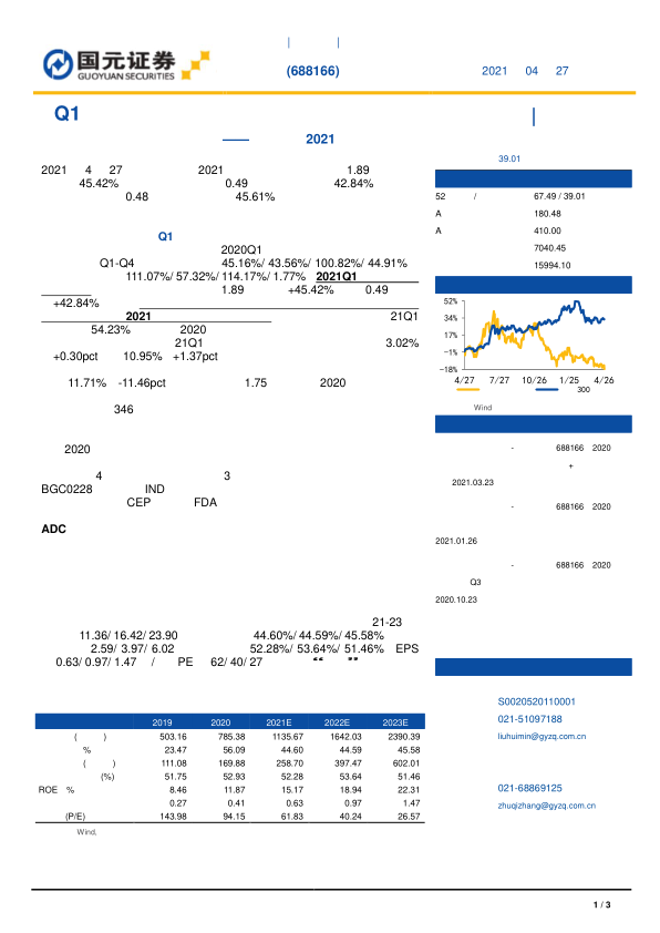 2021年4月27日,公司发布2021年一季报:实现营收为1.89亿元,同比增长45.42%;实现归母净利润为0.49亿元,同比增长42.84%;实现扣非归母净利润为0.48亿元,同比增长45.61%。