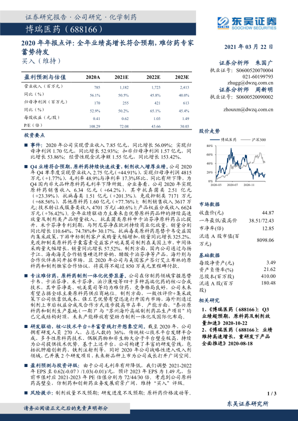 盈利预测与投资评级:由于公司毛利率有所降低,我们调整2021-2022年EPS至0.62(-0.07)/1.03(-0.01)/元,预计2023年EPS为1.49元,当前市值对应2021-2023年PE估值分别为72/44/30倍。考虑到公司原料药高壁垒,仿制药和创新药业务发展前景广阔,维持“买入”评级。