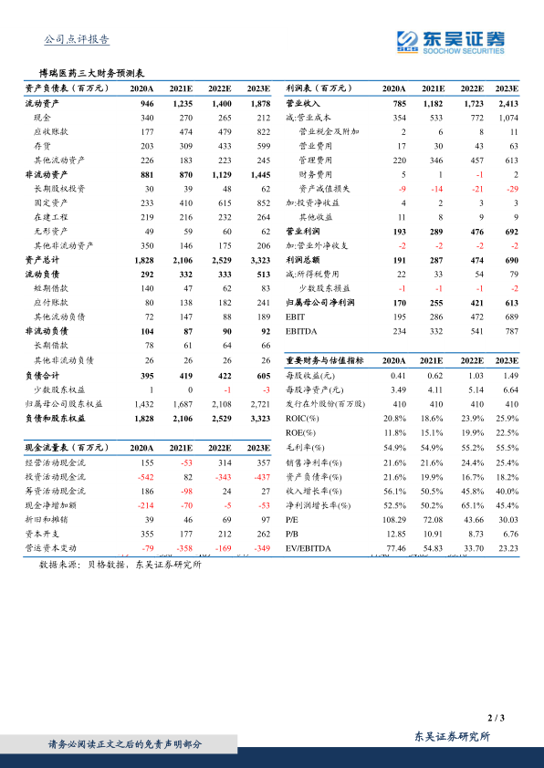 整体业绩高增长: 2020年,博瑞医药实现了营业收入7.85亿元,同比增长56.09%;归母净利润1.70亿元,同比增长52.93%;扣非归母净利润1.57亿元,同比增长53.86%。经营性现金流净额大幅增长153.42%至1.55亿元,显示出公司强劲的盈利能力和健康的现金流状况。这些数据表明公司在过去一年中取得了显著的经营成果,各项关键财务指标均呈现积极向上的趋势。