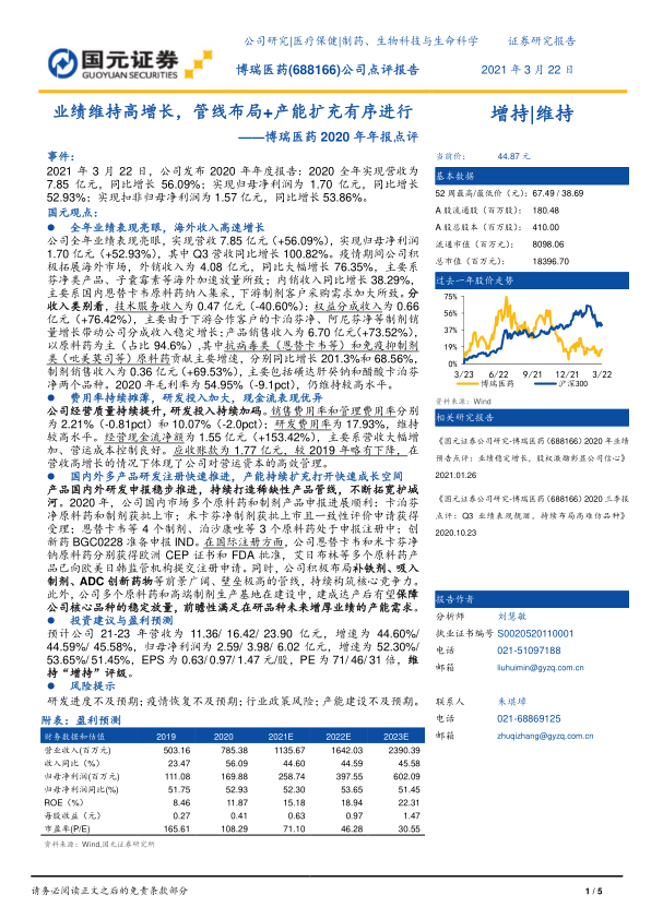 本报告对博瑞医药(688166)2020年年度报告进行了深度分析,核心观点如下: