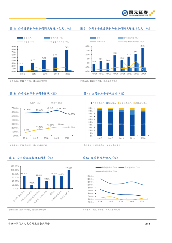 公司全年业绩表现亮眼,实现营收7.85亿元(+56.09%),实现归母净利润1.70亿元(+52.93%),其中Q3营收同比增长100.82%。疫情期间公司积极拓展海外市场,外销收入为4.08亿元,同比大幅增长76.35%,主要系芬净类产品、子囊霉素等海外加速放量所致;内销收入同比增长38.29%,主要系国内恩替卡韦原料药纳入集采,下游制剂客户采购需求加大所致。分收入类别看,技术服务收入为0.47亿元(-40.60%);权益分成收入为0.66亿元(+76.42%),主要由于下游合作客户的卡泊芬净、阿尼芬净等制剂销量增长带动公司分成收入稳定增长;产品销售收入为6.70亿元(+73.52%),以原料药为主(占比94.6%),其中抗病毒类(恩替卡韦等)和免疫抑制剂类(吡美莫司等)原料药贡献主要增速,分别同比增长201.3%和68.56%,制剂销售收入为0.36亿元(+69.53%),主要包括磺达肝癸钠和醋酸卡泊芬净两个品种。2020年毛利率为54.95%(-9.1pct),仍维持较高水平。