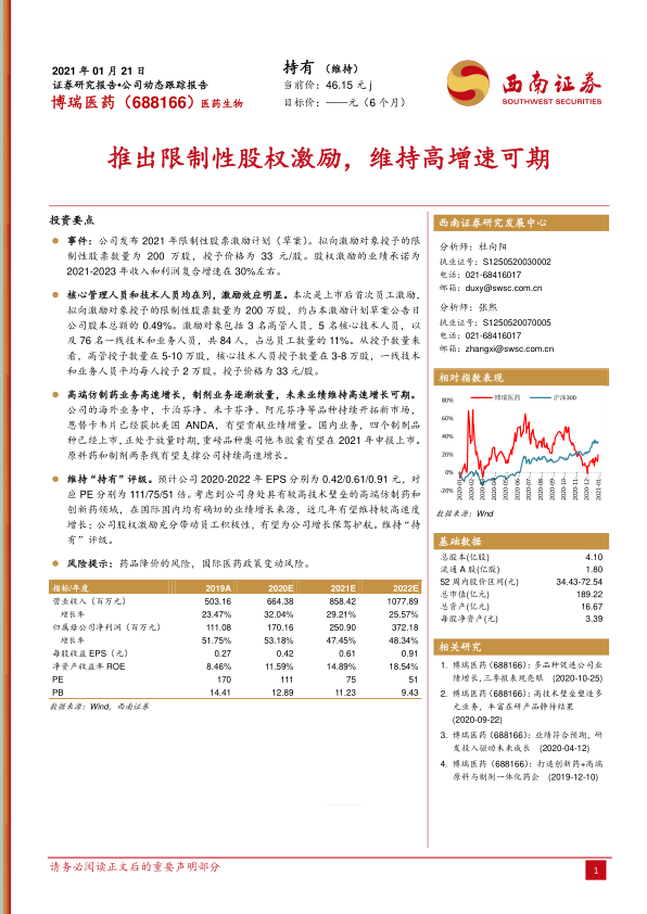 博瑞医药通过推出限制性股权激励计划,有效地将核心员工的利益与公司发展紧密结合,有望进一步激发团队活力。公司在高端仿制药和制剂业务上的双轮驱动策略,以及在国内外市场的积极拓展,为未来业绩的持续高增长奠定了坚实基础。维持“持有”评级,但需关注药品降价和国际医药政策变动等潜在风险。
