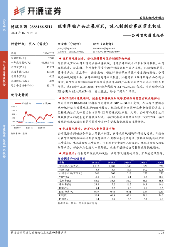 公司自主研发的双靶点减重降糖药BGM0504进展顺利,已进入III期临床试验方案设计讨论阶段,有望在庞大的糖尿病和肥胖症市场中占据一席之地。同时,公司凭借药械组合平台技术,成功进军高技术壁垒的吸入制剂蓝海市场,多款产品如吸入用布地奈德混悬液等已进入申报或临床后期,预计将驱动未来业绩显著增长。开源证券首次覆盖给予“买入”评级,预计2024-2026年归母净利润分别为2.17/2.27/2.50亿元。