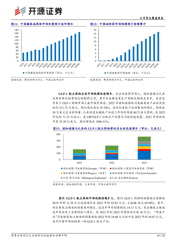 BGM0504注射液是公司独立研发的双重激动剂,可同时激活GIP和GLP-1受体,在治疗2型糖尿病和肥胖症方面展现显著潜力。近期已完成全国研究者会议,讨论其在2型糖尿病治疗及体重控制方面的III期临床试验方案。已完成的Ia期临床试验显示,健康志愿者平均体重下降3.24%~8.30%。II期临床研究初步结果显示,BGM0504在2型糖尿病患者中显著降低HbA1c、空腹血糖、餐后2h血糖等指标,在超重/肥胖患者中显著降低体重,且耐受性、安全性良好。 中国降糖减重药物市场空间庞大。据弗若斯特沙利文数据,中国糖尿病药物市场规模预计从2020年的632亿元增至2030年的近1700亿元;中国减肥药市场规模预计从2020年的19亿元快速增长至2030年的149亿元。全球GLP-1靶点药物市场快速增长,诺和诺德司美格鲁肽产品2023年营收约211.72亿美元,礼来替尔泊肽2023年营收跃升至53.39亿美元,同比增速达1006.51%。国内GLP-1药物市场规模由2019年的11.38亿元增至2023年的95.03亿元,CAGR高达69.98%,其中司美格鲁肽注射液2023年销售额达54.07亿元。国内GLP-1/GIP双靶点药物竞争格局相对较好,2023年获批受理号总数为35,全部为临床获批。