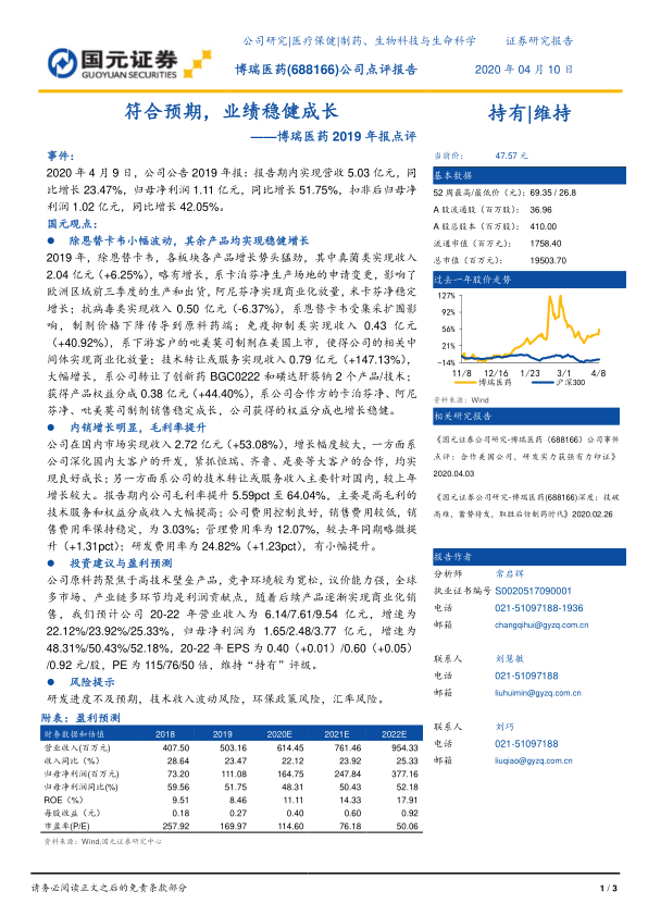 本报告分析了博瑞医药2019年报,认为公司业绩符合预期,并实现了稳健增长。