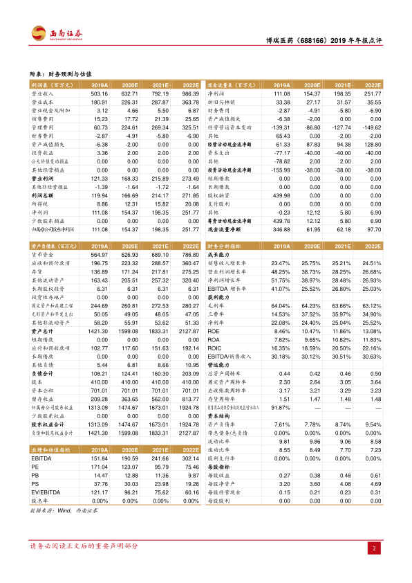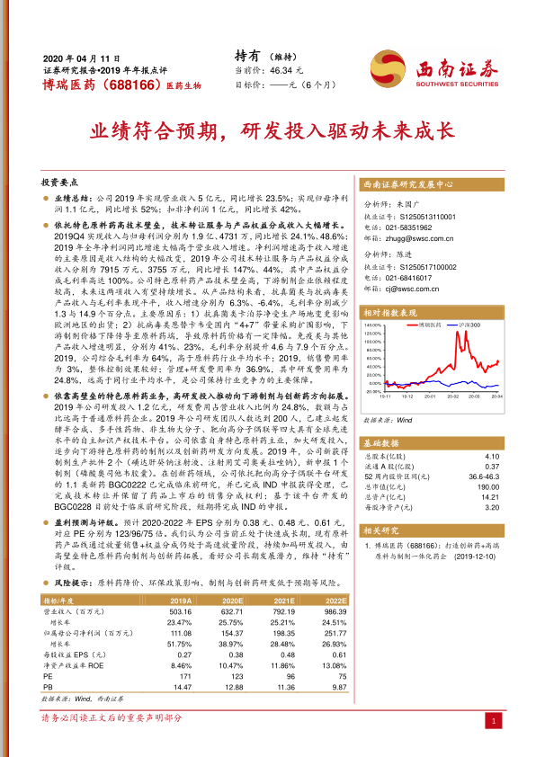 根据分析师预测,博瑞医药未来几年将继续保持稳健增长。预计2020年至2022年的每股收益(EPS)分别为0.38元、0.48元和0.61元,对应的市盈率(PE)分别为123倍、96倍和75倍。分析师认为,公司目前正处于快速成长期,现有原料药产品线通过放量销售和权益分成仍将保持高速增长。同时,持续加码的研发投入将推动公司从高壁垒特色原料药向制剂与创新药领域拓展,长期发展潜力巨大。基于此,分析师维持“持有”评级。