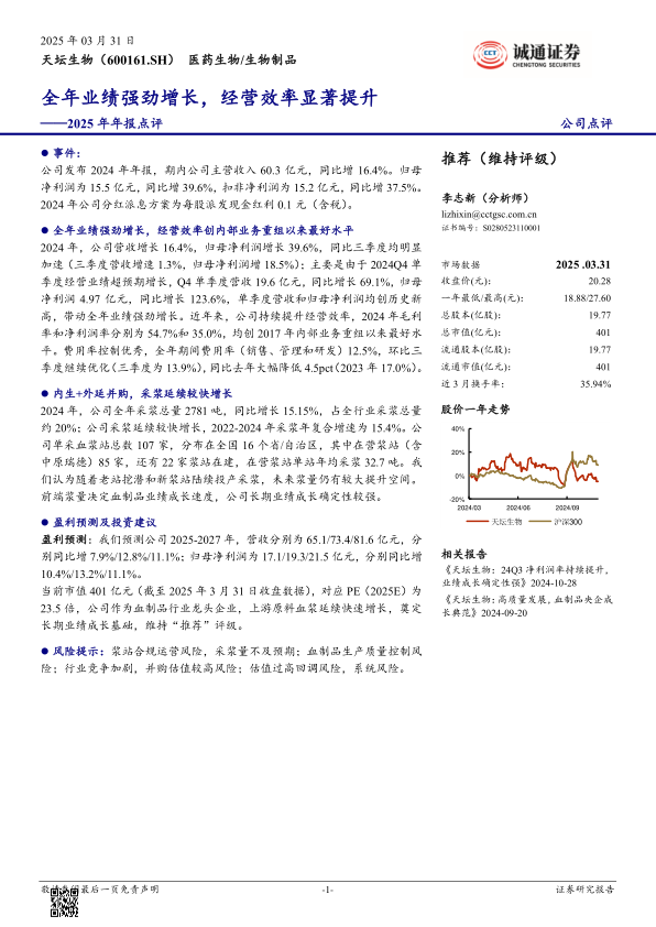 当前市值401亿元(截至2025年3月31日收盘数据),对应PE(2025E)为23.5倍,公司作为血制品行业龙头企业,上游原料血浆延续快速增长,奠定长期业绩成长基础,维持“推荐”评级。