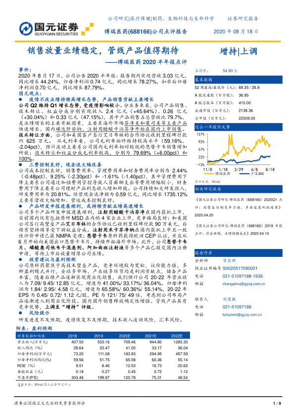 本报告对博瑞医药2020年半年报进行了全面分析,公司业绩增长稳健,盈利能力良好,研发投入持续加大,产品管线不断丰富。考虑到公司未来的增长潜力,将公司评级上调至“增持”。但同时也提示了研发进度、疫情恢复、技术收入和汇率等风险。
