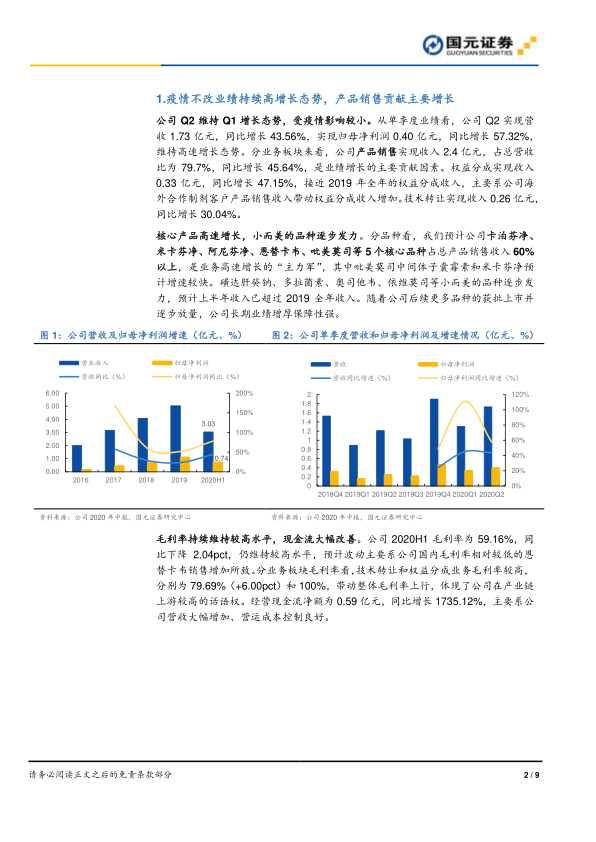 2020年上半年,博瑞医药实现营收3.03亿元,同比增长44.24%,归母净利润0.74亿元,同比增长78.27%。Q2维持Q1增长态势,受疫情影响较小。产品销售收入2.4亿元,同比增长45.64%,是业绩增长的主要贡献因素。