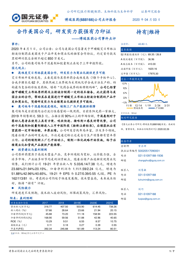 基于公司在高技术壁垒产品上的聚焦和丰富的研发管线,国元证券维持“持有”评级。