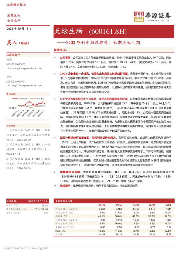 本报告分析了天坛生物2024年前三季度的业绩,认为公司净利率持续提升,采浆站扩张稳健,新品种层析静丙放量在即,长期成长潜力可期。虽然短期业绩承压,但维持“买入”评级。同时,报告也提示了竞争格局、销售和政策等风险。