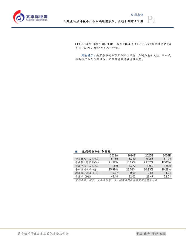 风险提示:供需态势缓和下产品降价风险,血制品集采风险,新一代静丙推广不及预期风险,产品质量及潜在责任风险。