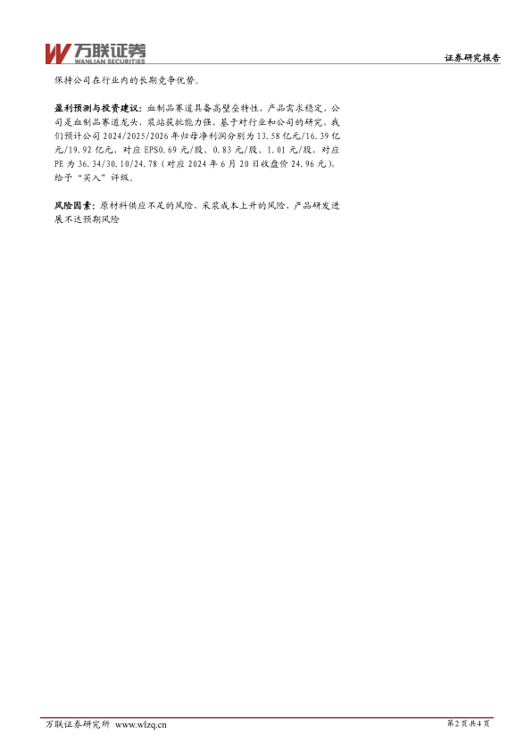盈利预测与投资建议:血制品赛道具备高壁垒特性,产品需求稳定,公司是血制品赛道龙头,浆站获批能力强,基于对行业和公司的研究,我们预计公司2024/2025/2026年归母净利润分别为13.58亿元/16.39亿元/19.92亿元,对应EPS0.69元/股、0.83元/股、1.01元/股,对应PE为36.34/30.10/24.78(对应2024年6月20日收盘价24.96元),给予“买入”评级。