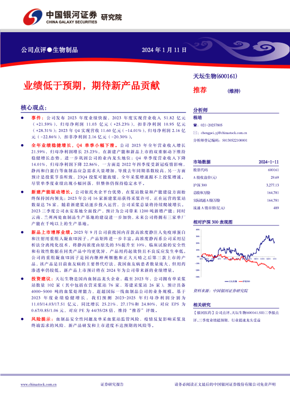 本报告对天坛生物(600161)2023年业绩进行了分析,并维持“推荐”评级。核心观点如下: