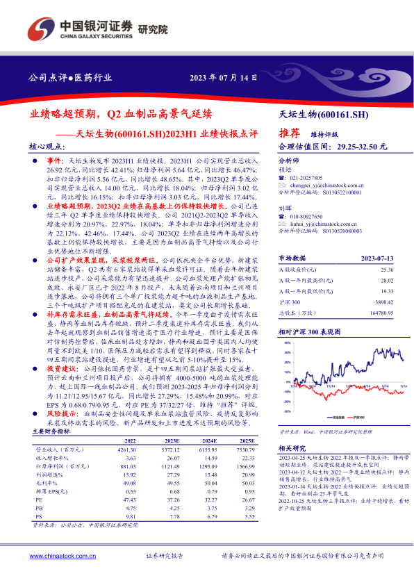本报告对天坛生物(600161.SH)2023H1业绩快报进行了点评,维持“推荐”评级,并分析了公司业绩增长的原因和未来发展潜力。