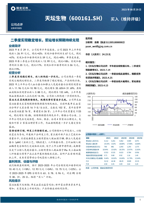 天坛生物2023年上半年业绩表现出色,营收和利润均实现显著增长。公司在浆站建设、采浆规模、产品研发等方面均保持领先地位,为未来的发展奠定了坚实基础。维持对公司未来盈利的预测和“买入”评级,但同时也提示了浆站拓展、监管、成本控制和产品价格波动等风险。