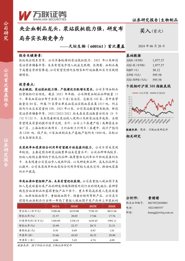 盈利预测与投资建议:血制品赛道具备高壁垒特性,产品需求稳定,公司是血制品赛道龙头,浆站获批能力强,基于对行业和公司的研究,我们预计公司2024/2025/2026年归母净利润分别为13.58亿元/16.39亿元/19.92亿元,对应EPS0.69元/股、0.83元/股、1.01元/股,对应PE为43.85/36.33/29.90(对应2024年6月19日收盘价30.12元),首次覆盖给予“买入”评级。
