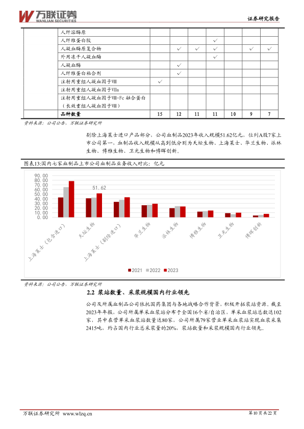 天坛生物凭借其央企背景,在浆站资源获取和终端市场覆盖方面均处于国内行业领先地位。截至2023年,公司拥有15个血制品品种,位列A股7家血制品上市公司之首,产品线涵盖人血白蛋白、静注人免疫球蛋白(pH4)、多种特免球蛋白以及人凝血因子Ⅷ等。在收入规模上,剔除进口产品部分,公司2023年血制品业务收入达51.62亿元,同样位居国内上市公司第一。
