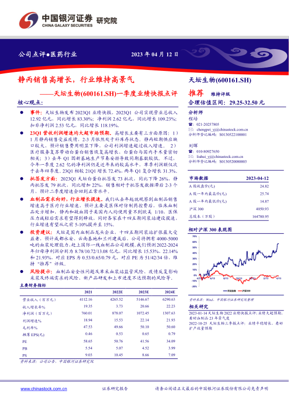 本报告对天坛生物(600161.SH)2023年一季度业绩快报进行了深度分析,维持“推荐”评级,并分析了血制品行业的高景气度。