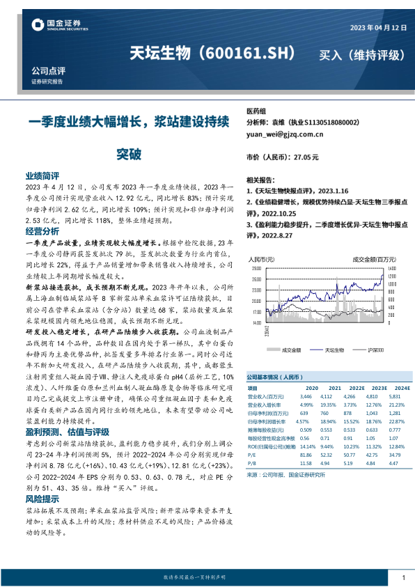 一季度业绩大幅增长,浆站建设持续突破