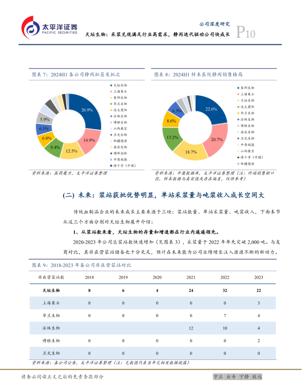 收购的浆站投产及单站采浆增长不及预期的风险;10%静丙推广不及预期的风险;产品安全性导致的潜在风险。