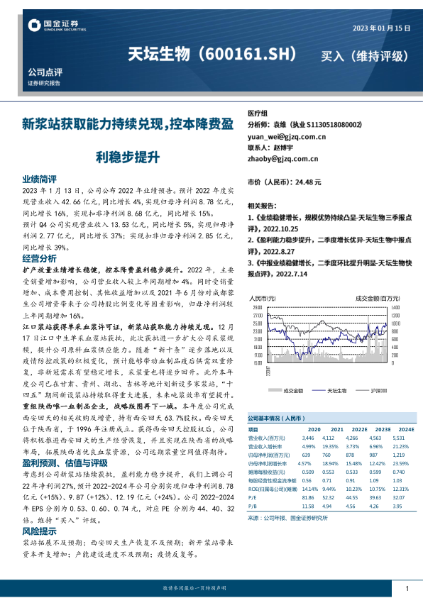 本报告对天坛生物2022年业绩预告进行了简评,分析了公司业绩增长的原因,包括销量增加、成本控制以及浆站拓展等因素。公司通过新浆站获批和重组西安回天,持续扩大采浆规模,优化浆源布局,为未来发展奠定基础。考虑到公司盈利能力稳步提升,上调了公司盈利预测,并维持“买入”评级。同时,报告也提示了浆站拓展、西安回天生产恢复、资本开支、产能建设进度以及疫情等风险因素。