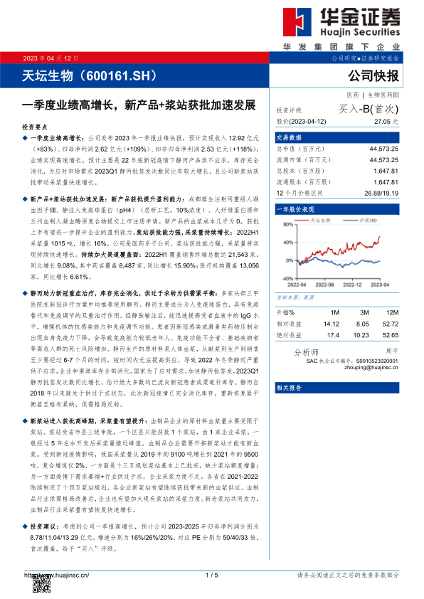 本报告基于天坛生物一季度业绩高增长,以及新产品和浆站获批带来的发展机遇,分析了公司未来的盈利能力和增长潜力。报告认为,新冠疫情带来的静丙供需格局反转,以及新浆站获批带来的采浆量提升,将成为公司未来发展的重要驱动力。首次覆盖,给予“买入”评级,但同时也提示了产品销售、降价以及新浆站推进等方面的风险。