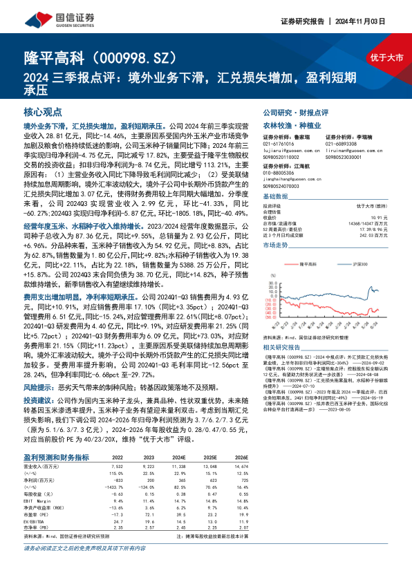 投资建议:公司作为国内玉米种子龙头,兼具品种、性状双重优势,未来随转基因玉米渗透率提升,玉米种子业务有望迎来量利双击。考虑到当期汇兑损失影响,我们下调公司2024-2026年归母净利润预测为3.7/6.2/7.3亿元(原为5.1/6.3/7.3亿元),2024-2026年每股收益为0.28/0.47/0.55元,对应当前股价PE为40/23/20X,维持“优于大市”评级。