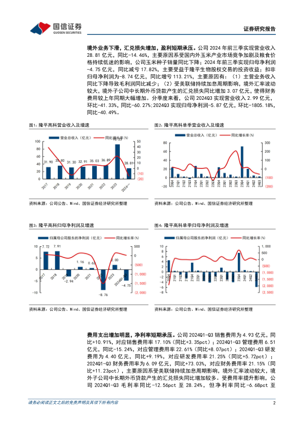 境外业务下滑,汇兑损失增加,盈利短期承压。公司2024年前三季实现营业收入28.81亿元,同比-14.46%,主要原因系受国内外玉米产业市场竞争加剧及粮食价格持续低迷的影响,公司玉米种子销量同比下降;2024年前三季实现归母净利润-4.75亿元,同比减亏17.82%,主要受益于隆平生物股权交易的投资收益;扣非归母净利润为-8.74亿元,同比增亏113.21%,主要原因有:(1)主营业务收入同比下降导致毛利润同比减少;(2)受美联储持续加息周期影响,境外汇率波动较大,境外子公司中长期外币贷款产生的汇兑损失同比增加3.07亿元,使得财务费用较上年同期大幅增加。分季度来看,公司2024Q3实现营业收入2.99亿元,环比-41.33%,同比-60.27%;2024Q3实现归母净利润-5.87亿元,环比-1805.18%,同比-40.49%。