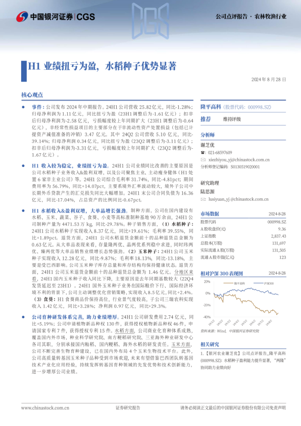 H1业绩扭亏为盈,水稻种子优势显著