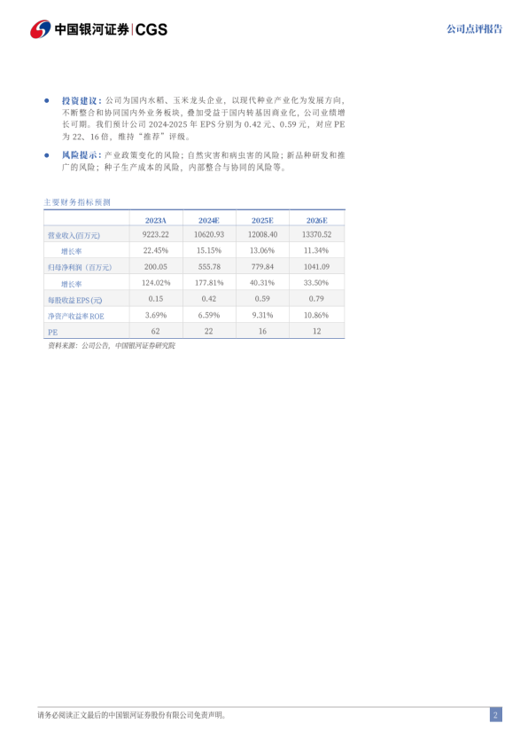投资建议:公司为国内水稻、玉米龙头企业,以现代种业产业化为发展方向,不断整合和协同国内外业务板块,登加受益于国内转基因商业化,公司业绩增长可期。我们预计公司2024-2025年EPS分别为0.42元、0.59元,对应PE为22、16倍,维持“推荐”评级。