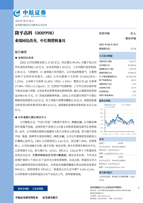 公司聚焦主业,“内生+外延”不断提升竞争力。外延方面,公司推动增持并表隆平发展,这将有利于加快引入丰富玉米种质资源及现代化育种体系。此外,公司收购水稻种企福建科力和玉米种企云南宜晟,将与隆平体系市场、渠道、制种等方面协同催化。内生方面,公司长年重视研发创新投入打磨核心竞争力。23H1公司研发投入1.61亿元,同比增7.59%。生物育种上,公司布局瑞丰生物、隆平生物、绿谷生物、国丰生物等生物技术平台,已获得瑞丰125、浙大瑞丰8、ncx-1、BFL4-2、CAL16等5个转基因性状的安全证书。生物育种商业化有望不断推进。据农业农村部,今年试点范围扩展到5个省区20个县并在甘肃安排制种。从试点看,转基因玉米大豆抗虫耐除草剂性状表现突出,对草地贪夜等鳞翅目害虫的防治效果在90%以上,除草效果在95%以上;转基因玉米大豆可增产5.6%-11.6%公司积极参与国家转基因玉米产业试点工作,取得重要进展