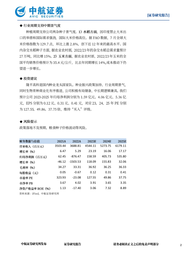 隆平高科是国内种业龙头国家队。种业振兴政策加持、行业周期景气、同时生物育种商业化有序推进,公司积极布局储备,中长期逻辑兼具。我们预计公司2023-2025年归母净利润分别为1.59亿元、4.06亿元、5.36亿元,EPS分别为0.12元、0.31元、0.41元,对应23、24、25年PE分别为127.55、49.86、37.75倍,维持“买入”评级。