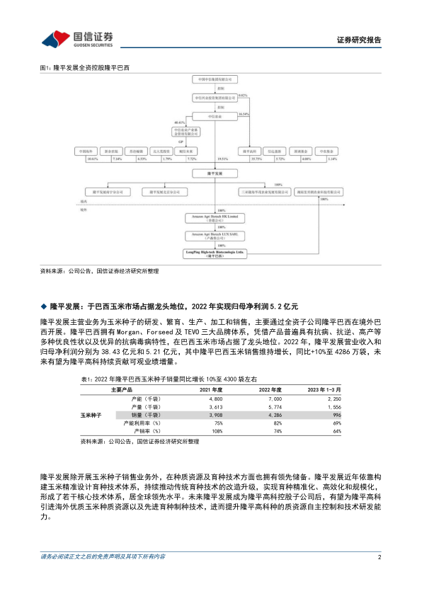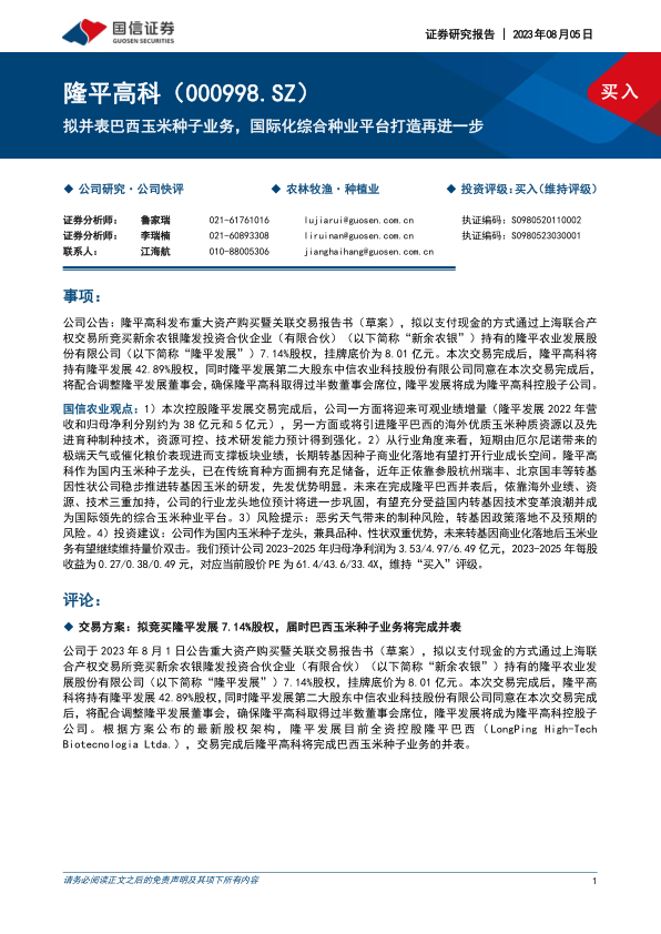 国信农业观点:1)本次控股隆平发展交易完成后,公司一方面将迎来可观业绩增量(隆平发展2022年营收和归母净利分别约为38亿元和5亿元),另一方面或将引进隆平巴西的海外优质玉米种质资源以及先进育种制种技术,资源可控、技术研发能力预计得到强化。2)从行业角度来看,短期由厄尔尼诺带来的极端天气或催化粮价表现进而支撑板块业绩,长期转基因种子商业化落地有望打开行业成长空间。隆平高科作为国内玉米种子龙头,已在传统育种方面拥有充足储备,近年正依靠参股杭州瑞丰、北京国丰等转基因性状公司稳步推进转基因玉米的研发,先发优势明显。未来在完成隆平巴西并表后,依靠海外业绩、资源、技术三重加持,公司的行业龙头地位预计将进一步巩固,有望充分受益国内转基因技术变革浪潮并成为国际领先的综合玉米种业平台。3)风险提示:恶劣天气带来的制种风险,转基因政策落地不及预期的风险。4)投资建议:公司作为国内玉米种子龙头,兼具品种、性状双重优势,未来转基因商业化落地后玉米业务有望继续维持量价双击。我们预计公司2023-2025年归母净利润为3.53/4.97/6.49亿元,2023-2025年每股收益为0.27/0.38/0.49元,对应当前股价PE为61.4/43.6/33.4X,维持“买入”评级。