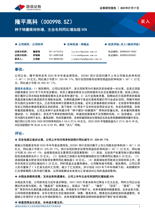 本报告对隆平高科2023年半年度业绩预告进行了分析,认为公司在逐步摆脱历史包袱的同时,主营业务尤其是玉米种子业务正迎来快速增长。公司在转基因玉米研发方面具有先发优势,一旦转基因政策落地,有望迎来更大的发展机遇。维持“买入”评级,但同时也提示了恶劣天气和政策落地不及预期的风险。